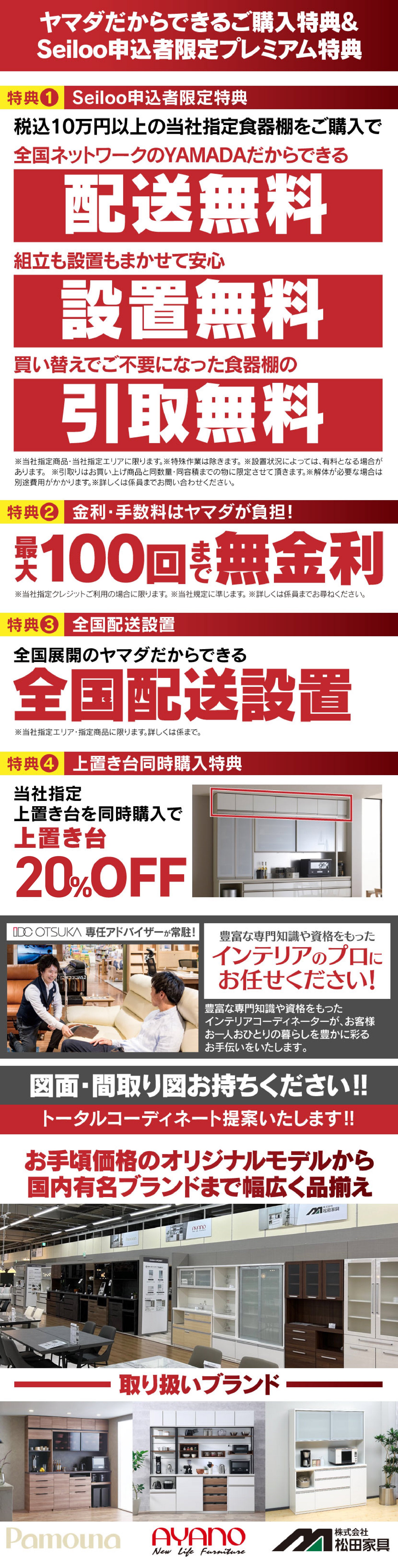 ポルトローナフラウ、ロルフベンツ、デセデ、エルバ、ハロ、カリガリス、シモンズ、サータ、シーリー、レガリア、フランスベッド、パラマウントベッド、ヒモラ、エコーネス、秋田木工、浜本工芸、エコーネス、パモウナ、綾野製作所、シギヤマ、松田家具、IDC OTSUKA |